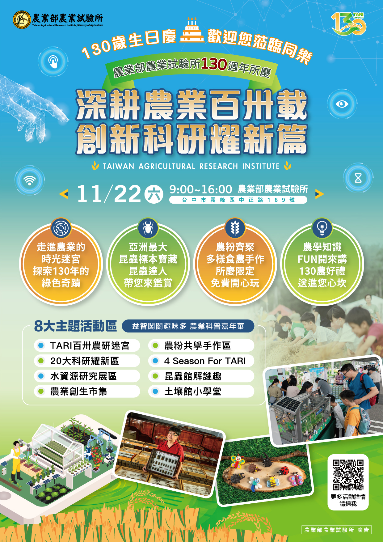 本所為慶祝創立130週年,於114年以「深耕農業百卅載、創新科研耀新篇」為主題辦理各項展示活動。