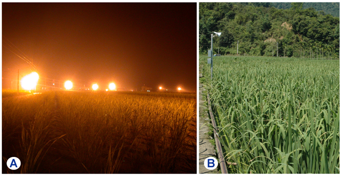 Manchurian wild rice (Zizania latifolia) or ‘Jiao-Bai’ is grown in shallow water. It is an important vegetable crop produced mainly in Nantou county, Taiwan. Infection of stem base of wild rice plants by the smut fungus (Ustilago esculenta) resulted in formation of swollen basal stems called a gall or ‘Jiaobai Shun’ which are harvested and used as vegetable. Traditionally, the Manchurian wild rice was planted in January and the swollen basal stems or Jiaobai Shun were harvested in April. However, Manchurian wild rice planted earlier than January resulted in poor yields of Jiaobai Shun due to poor growth, stunting of plants and high incidence of abnormal galls or of no commercial value. Studies at TARI showed that extending the light period to over 14 hr/day with the aid of artificial illumination not only prevented growth retardation of plants but also caused wild rice plants to produce edible Jiaobai Shun 30 days earlier than the conventional cultural practices without the illumination treatment. This lighting treatment technique is now widely used for the commercial production of stem base galls or Jiaobai Shun from plants of Manchurian wild rice in Taiwan.