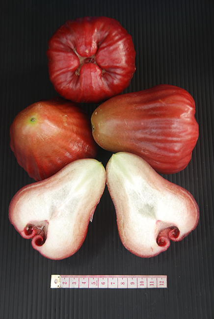 Wax-apple Tainung 3 or ‘Sugar Barbie’ is the second hybrid variety in Taiwan. Plants of ‘Sugar Barbie’ grow vigorously and new shoots emergence rapidly. Mature fruits are purplish red with a intensive, protuberant surface. Fruit size of ‘Sugar Barbie’ averaged weighing around 200 g. However, large fruits weighing up to 380 grams are also common. Total soluble solid (TSS) content of mature ‘Sugar Barbie’ fruits averages 12º Brix, while the sugar/acid ratio is lower than that in the ‘Indonesia Big Shape or Palm’ variety of wax apple. Compared to the ‘Indonesia Big Shape or Palm’ wax apple, flesh of ‘Sugar Barbie’ is crispier, juicier and special flavor with sweet-sour.