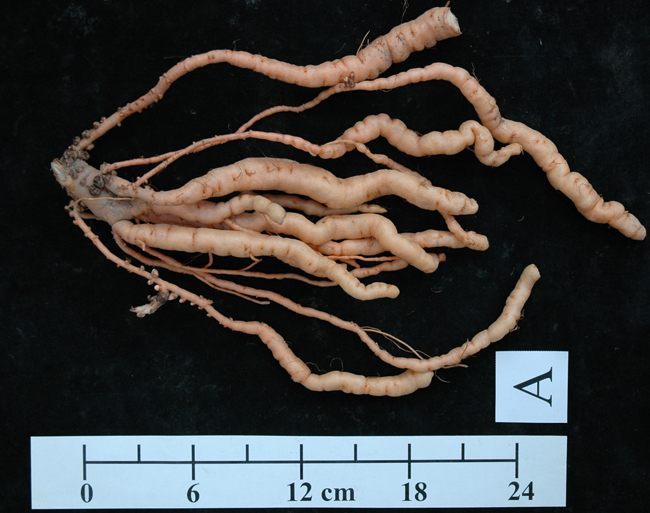 地黃 (Rehmannia glutinosa) 為常用中藥材,一般四物湯及六味地黃丸等方劑都有使用。地黃利用部位為塊根,新鮮採收為鮮地黃,乾燥後稱生地黃。地黃重要機能成分為地黃多醣、水蘇糖及梓醇 (Catalpol) 等,依文獻記載鮮地黃中有較高的梓醇含量,具有血糖調節、促進胃液與唾液之分泌及利尿等作用,可進行相關機能性產品開發。台灣的生地黃及熟地黃大都自中國進口,目前國內沒有經濟規模栽培,惟由於機能性藥膳市場需求甚殷,未來產業利用可期。本所經多年研究,業已成功建立地黃之繁殖與栽培技術,可在台灣平地生產高機能成分的鮮地黃。