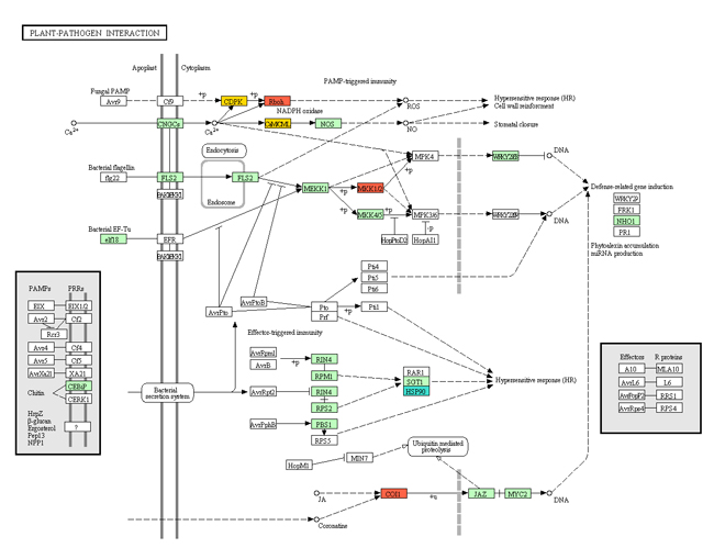 白葉枯病是危害水稻產量的主要病害之一,而抗性性狀多屬複雜的數量性狀。因此,本研究結合基因體、轉錄體及蛋白質體等分析技術,探討水稻白葉枯病抗性性狀的參與基因群與代謝路徑,以作為日後探討生理機制及分子育種應用的基礎。目前已成功利用轉錄體及蛋白質體技術,分析白葉枯病抗性突變體與誘變親感染病原菌後的差異表現基因群,發現30個抗性的候選基因。進一步抗性連鎖性分析,發現其中14個基因的鄰近SSR標誌與抗性突變體之抗性性狀有明顯的連鎖性。另一方面,也發現多醣(N-glycan)合成、DNA的複製、修復及重組、steroid生合成、Tyr及Phe代謝、glycerophospholipid代謝、isoquinoline代謝等代謝路徑與白葉枯病抗性有關。目前這些與抗性連鎖的候選基因,可作為開發eQTL及pQTL分子標誌的基礎,以應用於後續改良白葉枯病抗性改良之分子輔助育種計畫。另一方面,參與抗性的代謝路徑資料,可作為重建水稻抗病生理研究的基礎。