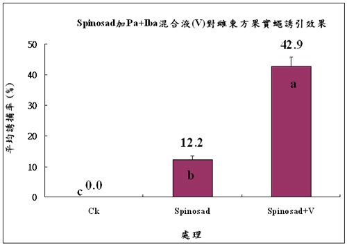 來自東方果實蠅寄主或非寄主植物揮發性氣味成分,已有研究顯示能誘引懷卵之雌東方果實蠅。為增進誘殺進入果園產卵雌東方果實蠅效果,本所自60種植物揮發性成分中,經試驗篩選出Pa、Iba及Bb三種成分,其混合液對懷卵雌東方果實蠅誘引效果大於卵巢未發育之雌蠅,且網籠試驗結果顯示,可提高賜諾殺濃餌劑及蛋白質水解物等食物餌劑對雌東方果實蠅誘殺效果。