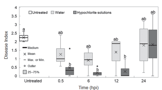 Pitaya (Hylocereus spp.) is an economically important fruit crop, and wet rot disease caused by Gilbertella persicaria has become a major concern to the industry. This study aimed to evaluate the efficacy of hypochlorite solution (pH 8.1–8.4) in controlling postharvest wet rot disease of pitaya fruit. In an in vitro assay, hypochlorite solution with available chlorine concentrations up to 200 mg L-1 didn’t significantly inhibit mycelial growth of G. persicaria. In contrast, spore germination was effectively suppressed at concentrations above 150 mg L-1. Further artificial inoculation tests using fruits of white-fleshed pitaya cultivar revealed that postharvest treatment with 200 mg L-1 hypochlorite solution for 30–60 s significantly reduced the disease index (rated on a 0–4 scale based on the diseased area) of wet rot disease. Evaluations of treatment timing indicated that application within 12 h after inoculation significantly reduced the disease index, whereas treatments applied after 24 h showed no significant difference compared with the untreated control. Notably, with the same treatments, no protective effect was observed on red-flesh pitaya cultivar artificially inoculated with the pathogen. Postharvest treatments of naturally infected fruits under field conditions revealed that application of hypochlorite solution containing 200 mg L-1 chlorine reduced the average disease incidence of wet rot in white-flesh pitaya from 43.0 ± 6.5% in untreated fruits to 9.4 ± 4.5%, achieving a control efficacy of 79.0 ± 11.3%. In contrast, the same treatment unexpectedly increased disease incidence in red-flesh pitaya, with the average incidence rising from 43.0 ± 20.8% in untreated fruits to 69.2 ± 13.9%. Overall, fruit postharvest treatment with hypochlorite solution effectively reduces wet rot disease index in white-fleshed cultivar, however, alternative management strategies are required for red-fleshed cultivars.