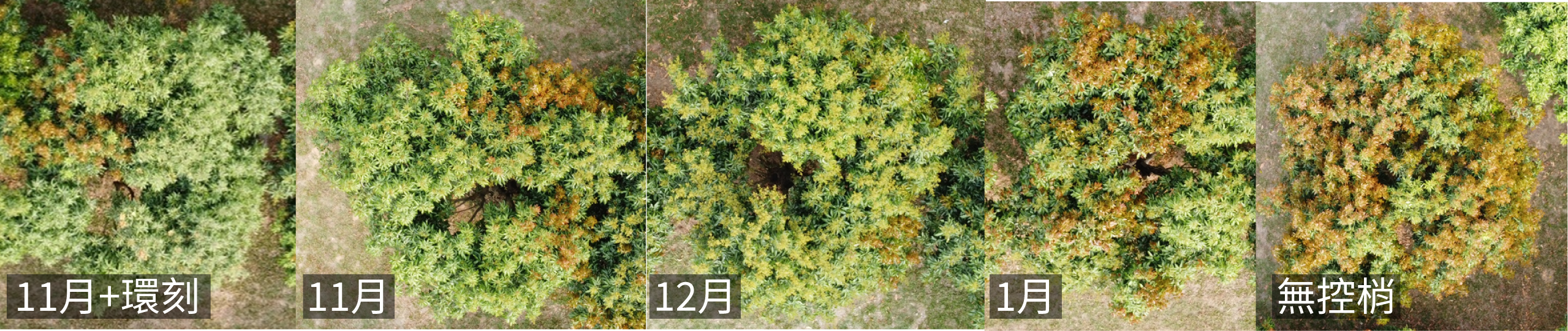農試所表示,為探討調適策略,觀摩會現場展示不同控梢時機對開花的影響。試驗結果顯示,以12月中旬進行控梢處理的開花率最高,可達77.1%;11月中旬控梢次之,開花率為55.6%;11月中旬控梢搭配環刻處理開花率僅24.8%;1月中旬控梢開花率為35.6%;未進行控梢的對照組則僅26.7%。該所指出,控梢時機須配合葉片成熟度,若葉片尚未完全成熟即提前處理,效果有限;另在乾旱年度下,環刻處理反而可能不利抽穗開花。