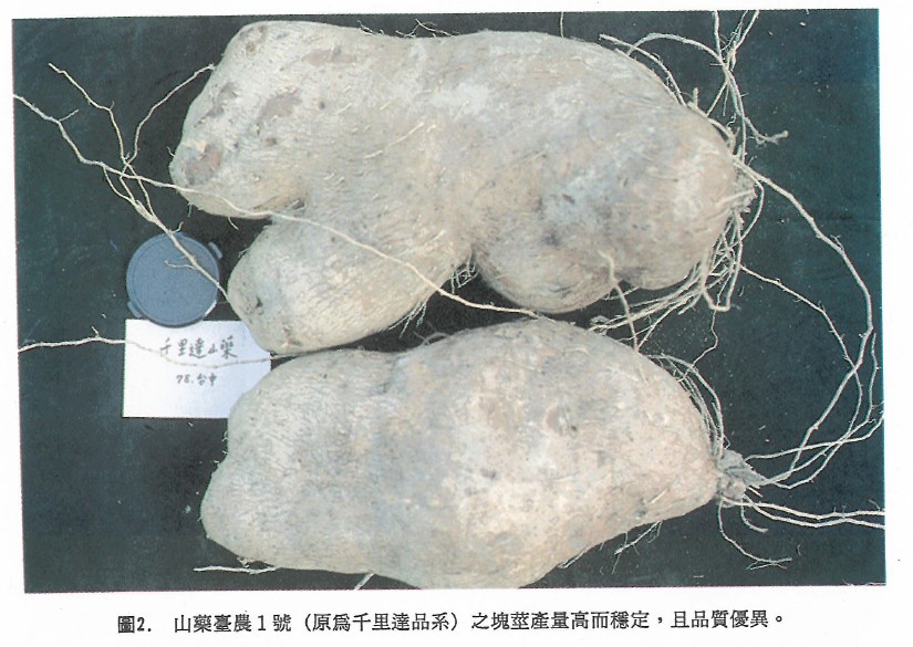 山藥新品種臺農1號之親本源自千里達地區之Coconut-Lisbon,自1967年引進後,歷經多年馴化與選育試驗,於1991年命名推廣。新品種具有繁殖容易、產量高而穩定、品質優越及適應力大之優點,能適應本省海拔800m以下之生長環境,其地上部蔓及葉生長旺盛,蔓長可達6m,地下部塊莖產量高而穩定。由四次區域試驗之產量結果可知,臺農1號之平均公頃塊莖產量達22t/ha。新品種塊莖皮薄,肉厚、色白且多粘質,富含澱粉、蛋白質及多種礦物質與必需胺基酸,營養價值甚高,可供食用、加工用及藥用。新品種塊莖在17°C或14°C下之貯藏時間可達26週或32週以上,在利用上具有很大的內銷及外銷潛力。