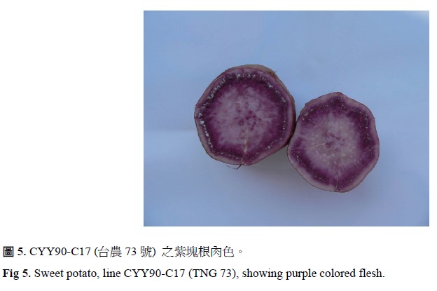 甘藷新品種台農73號於89年以清水紫心為母本,台農62號為父本,所產生之雜交後代,並於90年實生系後代中選拔而得到之優良品系CYY90-C17。本品系在91年秋作第一年組 (初級試驗) 之塊根產量為每公頃25,999 kg,較對照種台農57號增產1.2%,92年第二年組 (高級試驗) 之塊根產量為每公頃29,334 kg,較對照種台農57號增產21.1%;另外94–95年區域試驗之塊根產量平均為33,899 kg,低於對照種台農57號。本品種塊根皮色為淡紅色,肉色為深紫色,富含cyanidin及peonidin等花青素,具抗氧化功用,且藷形整齊,食味佳,可作為鮮食用及烤藷等加工用途,為第一個台灣自行育成之紫肉甘藷品種,極具發展潛力,已於96年3月16日經審查通過,正式命名為甘藷台農73號。
