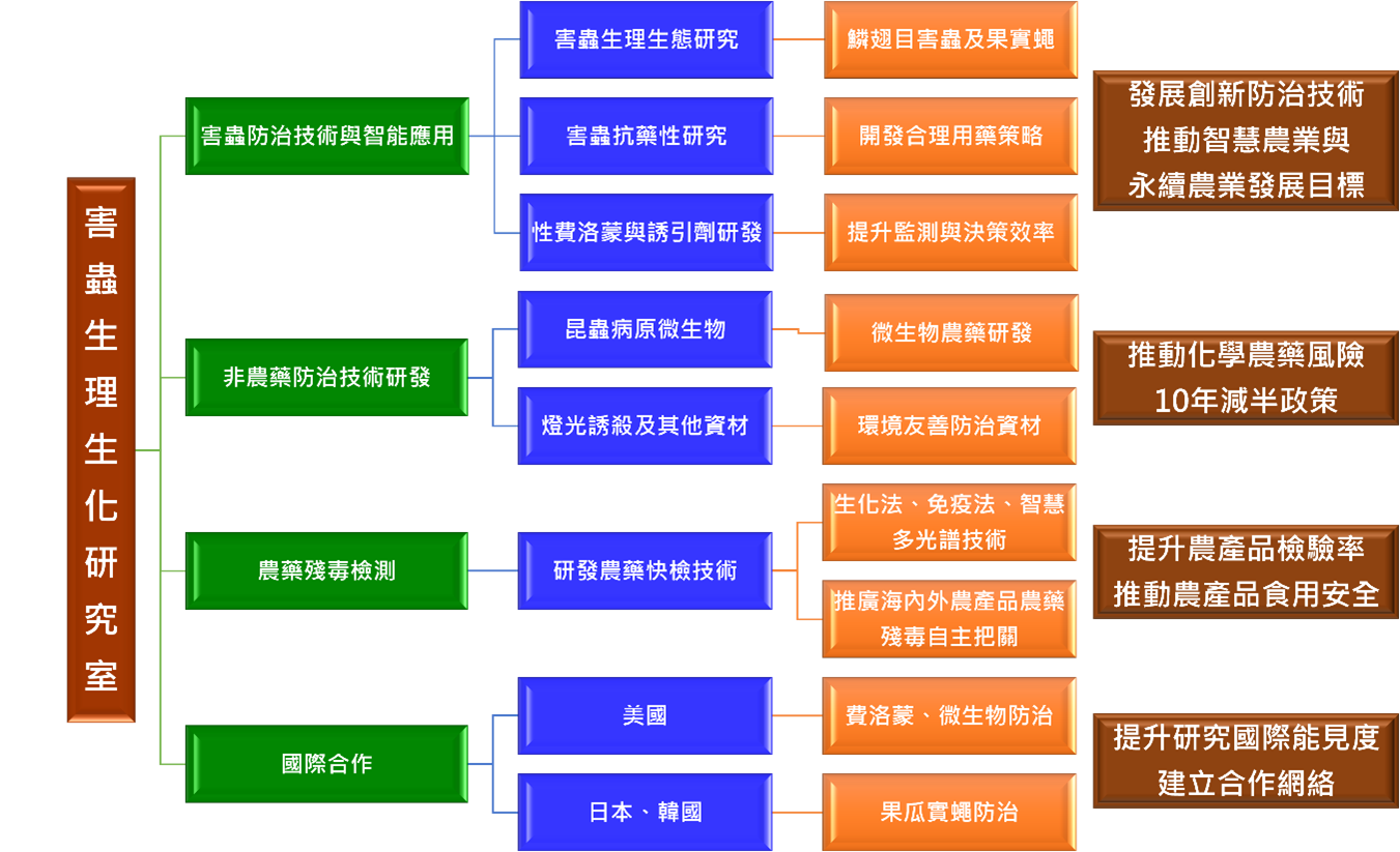 以害蟲生理與生化特性研究為核心,結合行為與生態資料,發展創新防治技術與農藥殘毒快速檢驗技術。研究重點分為四大方向: