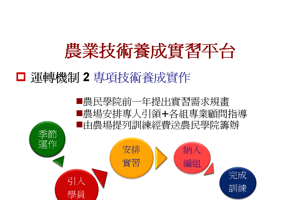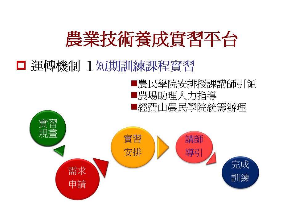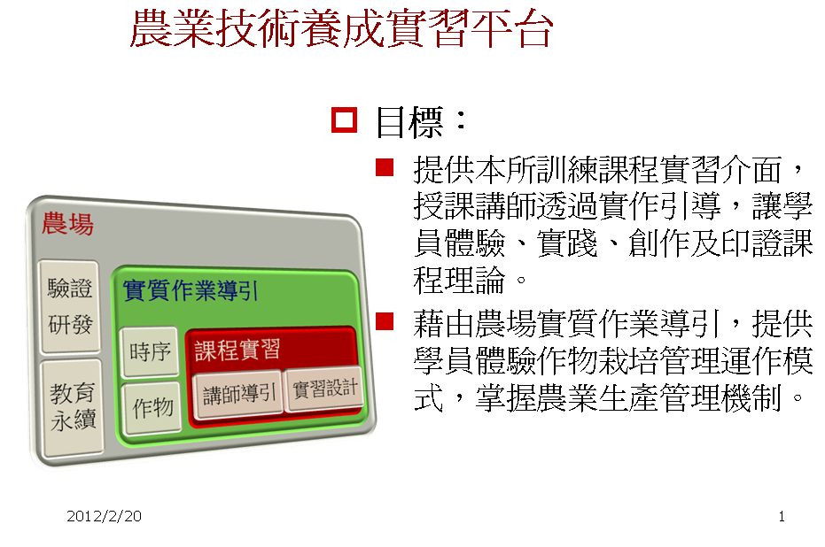 提供本所農民學院訓練課程實習介面,讓授課講師透過實作引導,使學員體驗、實踐、創作及印證課程理論。並藉由農場實質作業導引,提供學員體驗作物栽培管理運作模式,掌握農業生產管理機制。
