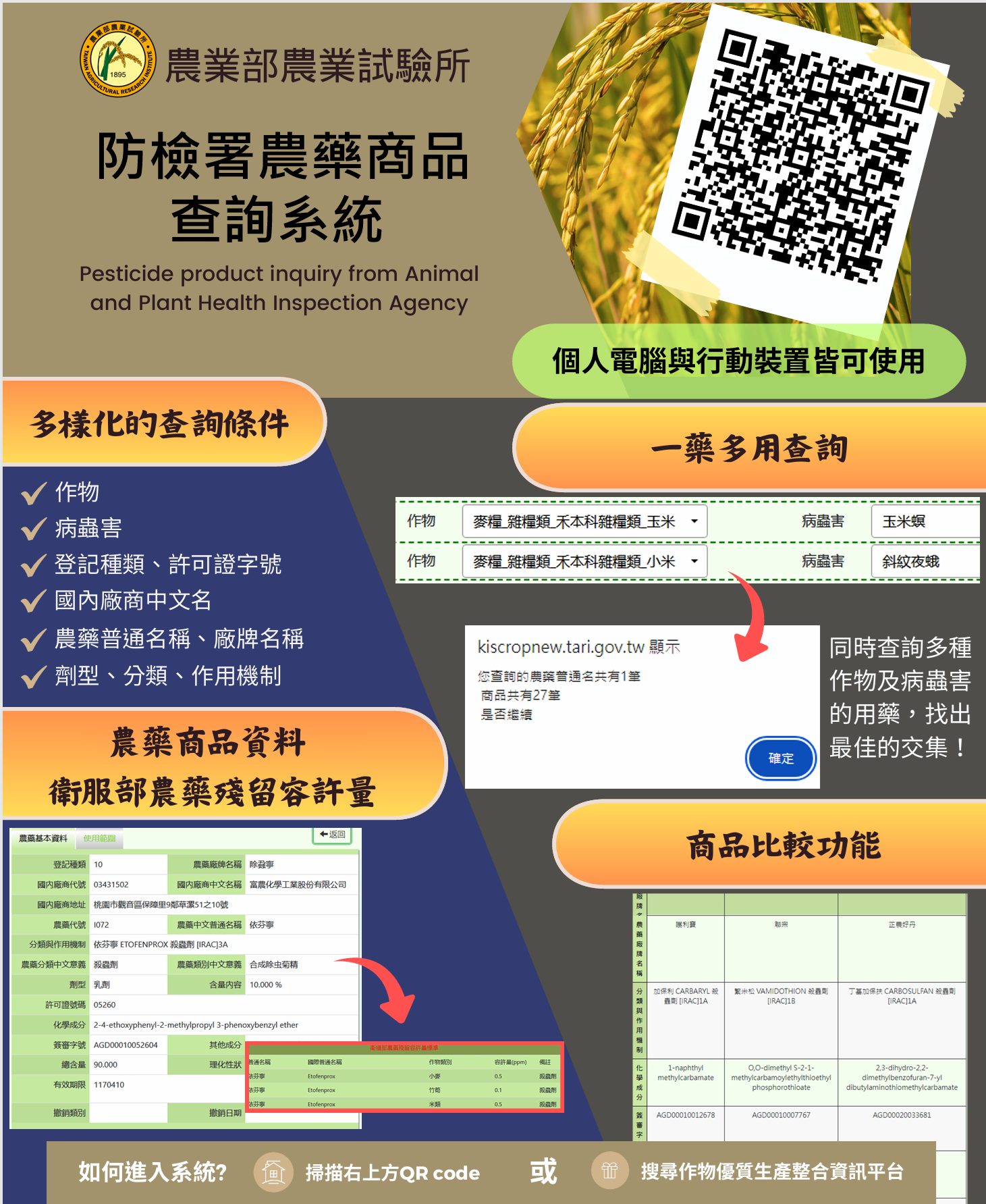 「防檢署農藥商品查詢系統」由農業試驗所建置,系統收錄了動植物防疫檢疫署的登記農藥商品與衛福部農藥殘留容許量標準之資料,查詢篩選條件多元,包括農藥普通名稱、商品廠牌名稱、登記種類、許可證字號、劑型、分類、作用機制及國內廠商資訊,支援電腦與行動裝置瀏覽,透過QR Code即可快速進入,提供使用者完整且即時的農藥商品查詢服務。