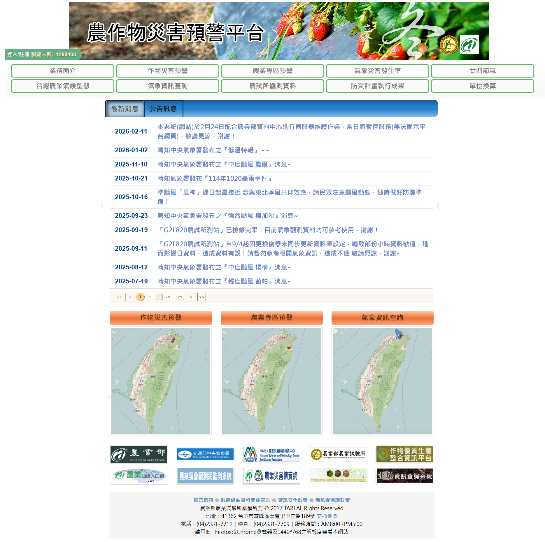 農業試驗所於105年度特開發「農作物災害預警平台」(圖1),以作物生理特性、不同生育階段及易致災臨界氣象條件為基礎,結合中央氣象局即時觀測資料與氣象預報作業,針對各鄉鎮市區主要栽培作物與農業專區進行”週 ”時間尺度之氣象災害精緻化預報,以提供農民平時氣象資訊查詢與早期災害預警用。