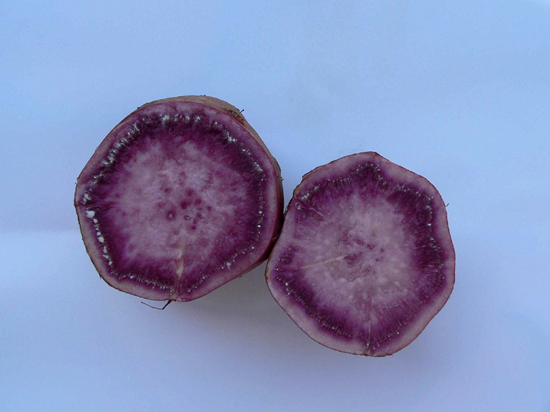 本品種長蔓平均長154公分,莖徑平均0.51公分,綠色,無茸毛,節間長平均5.0鼻形,綠色,葉長平均11.2公分,寬6.8公分,頂葉綠色,葉形較細小,葉柄綠色,無茸毛。塊根形狀為紡錘形,表皮為粉紅色,光滑,表皮脈少,皮目淺。肉色為深紫色。植株開花期自10月至12月間,植株開花多。