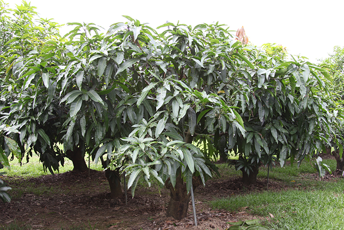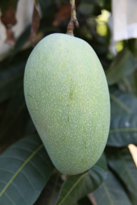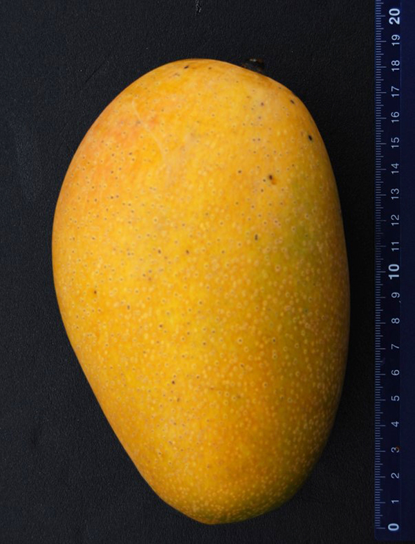 本品種主枝呈半開張,枝梢生長為平展形態;嫩葉深紅褐色,成熟葉片濃綠色,初花期較‘愛文’晚,但比‘金煌’早;果柄著生處的果基形態微凹,果實呈長橢圓,果重為670公克,有突起花柱痕跡,幼果至中果果皮為綠色,黃熟果果皮為黃帶橙,果實帶有香味,皮孔非常顯著,果肉為橙色,質地多汁,纖維量少,果肉率高,可溶性固形物含量可達17.4°Brix,果實品質優良。